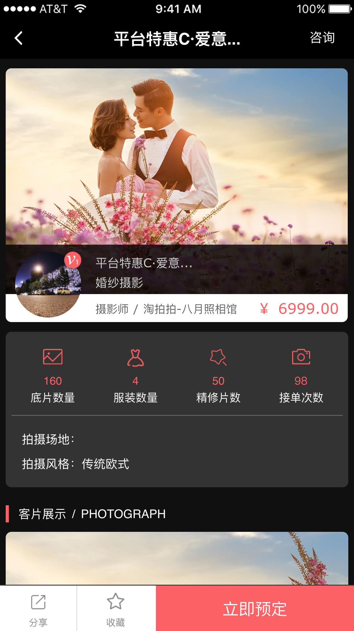 1、找到你想要的风格后,与摄影师预约并选择预订,可以预订不同的拍摄风格。