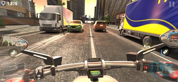 驾驶操作十分简单:摇动屏幕控制方向,注意躲避公路上的车辆;手动点击控制油门与刹车以及使用氮气加速;甚至还可以完成精彩的摩托抬头特技操作!