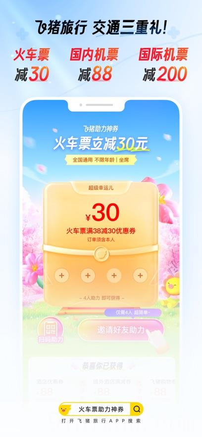 5. 「好友助力」邀请好友助力得神券,火车票减30,国内机票减60,国际机票减200;