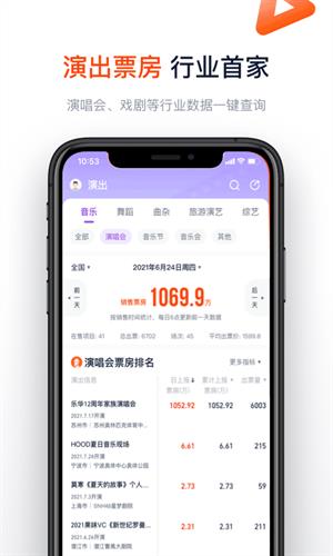 3、演出票房数据:公开演出行业票房,查看各地区、演出类型票房数据。