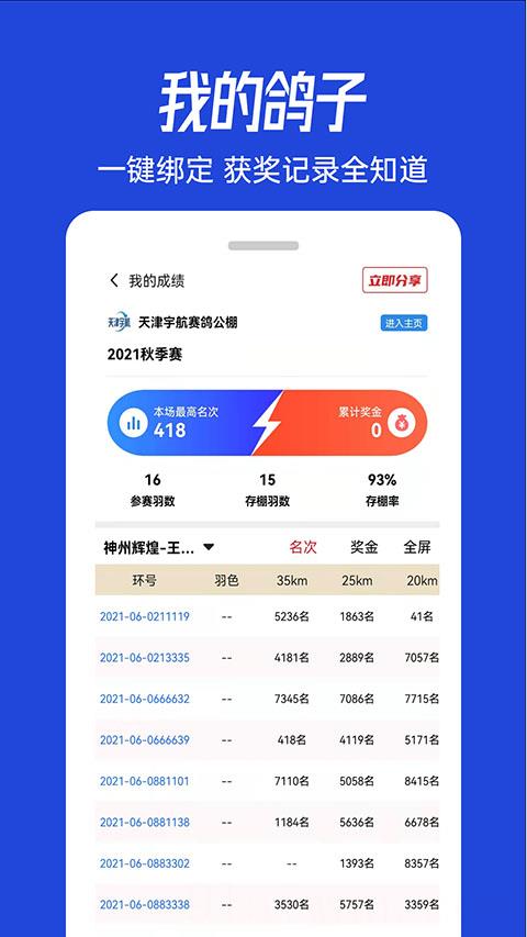 4、个人赛鸽记录清晰:绑定鸽子后,获奖记录清晰展示,方便回顾与总结。