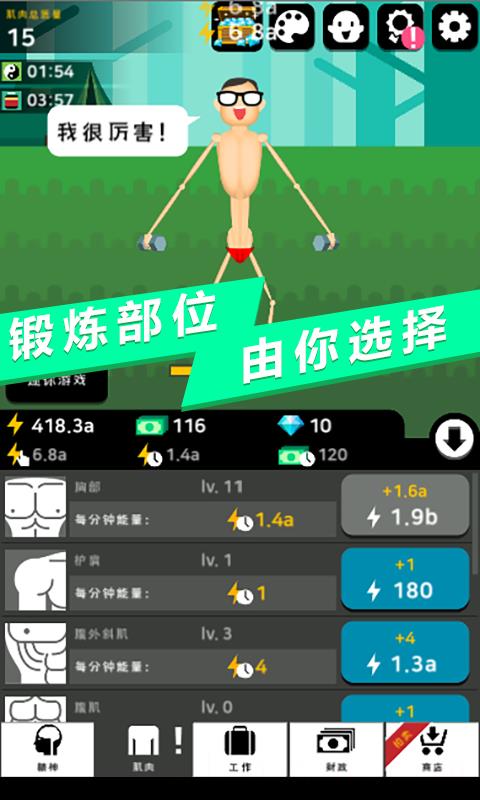 《肌肉王养成记》是一款极具魔性与趣味的休闲养成游戏。玩家将从一个瘦弱的少年起步,通过点击训练和挂机健身,逐步塑造出完美的肌肉身材。游戏巧妙地结合了放置养成与经营玩法,既能体验撸铁的爽快感,又能通过努力工作赚钱,购买豪宅和超跑。你将从工地搬砖的普通劳动者,成长为华尔街的精英,多种职业任你选择,每一份工作都将带来不同的收益。夸张的肌肉增长效果和搞笑的健身动画,让整个养成过程充满了欢乐和惊喜。