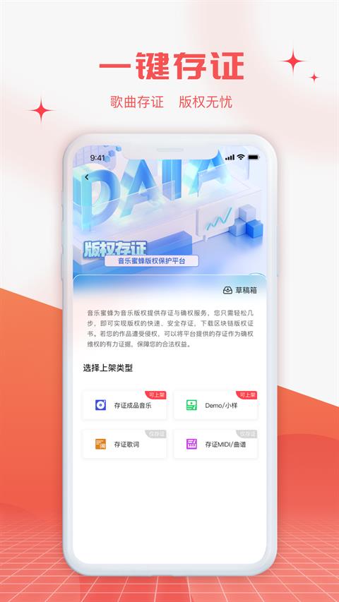 1、多元免费存证:支持音频、歌词、曲谱、MIDI等多种格式作品免费存证确权,覆盖音乐创作各要素。