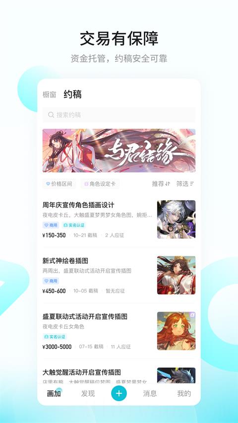 《画加》是二次元同人美术领域的重要平台,旨在为需求方与画师搭建一个高效、无缝的对接桥梁。作为约稿的得力助手,它不仅简化了约稿流程,还为画师提供了一个展示作品和交流创意的广阔空间。用户可以在平台上欣赏到来自各路大神的精彩作品,并通过便捷的约稿功能,迅速与心仪的画师达成合作,推动创意的实现,展现创作的价值。