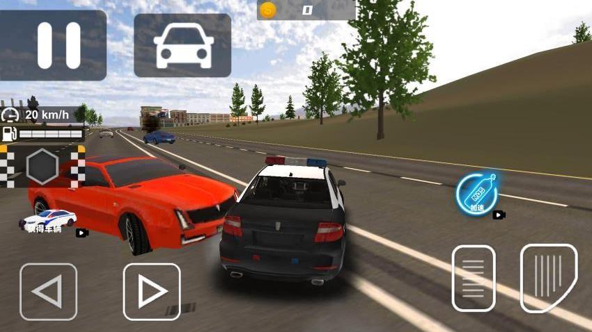 2、驾驶警车在道路上执行任务时,利用屏幕下方的控制按钮操控车辆,注意车速和油量,适时超越或拦截其他车辆,完成任务目标。
