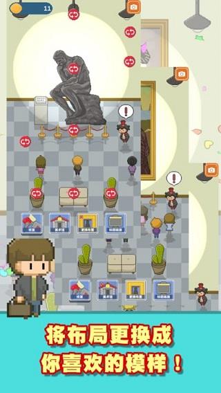 2、自由展馆布局系统:提供多种展柜、装饰与灯光方案,玩家可按主题或色系自由搭配,打造个性化美术馆空间吸引不同游客群体。