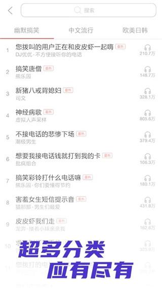 5、精细分类易查找:提供细致铃声分类,涵盖经典、原创、搞笑等类型,搭配超1000万精彩铃声合辑,快速定位目标铃声。