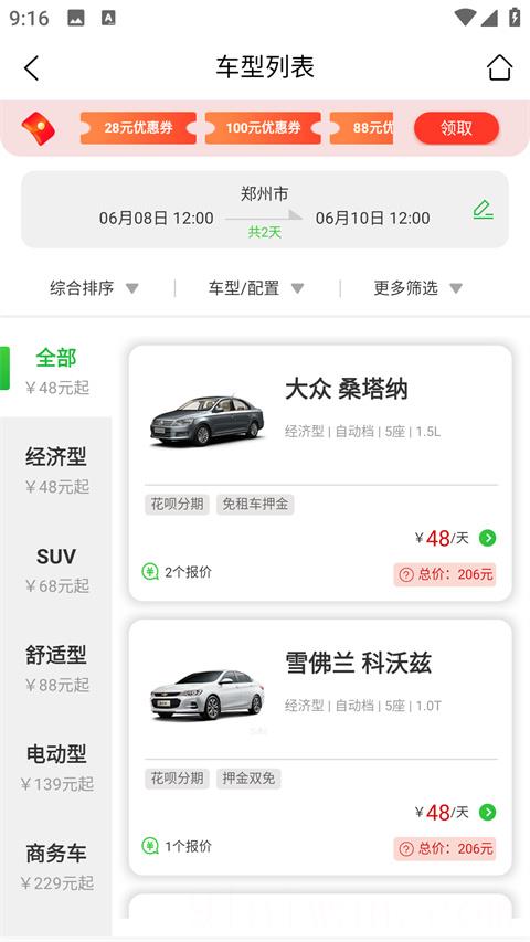 3、在【车型列表】页面,根据需求筛选车型,查看价格和配置,选择合适车辆租赁。