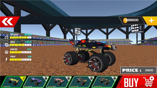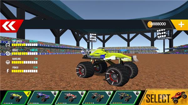 1、打开游戏,在车辆选择界面,查看不同车辆的属性,点击【SELECT】选择心仪的怪物卡车。