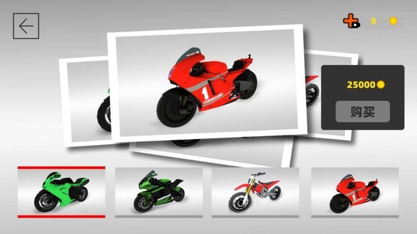 2、进入车库界面后,从展示的摩托车(如绿色、红色等款式)中选择,点击【选择】按钮,确定所选摩托车,以便进入游戏驾驶场景。