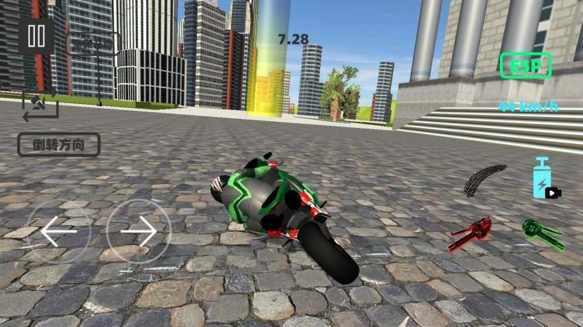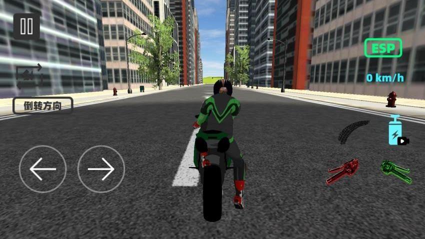 3、在驾驶场景,通过左右箭头控制摩托车方向,利用【倒转方向】功能调整行驶,关注右侧的ESP等功能图标;在城市道路中行驶,躲避障碍物,体验摩托车驾驶的操作乐趣,享受游戏中的驾驶场景。