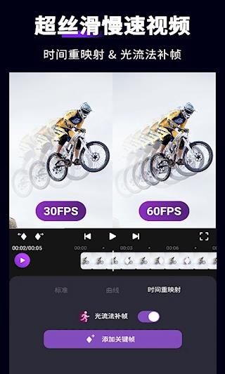 2.光流补帧:通过光流法生成丝滑慢动作视频,效果媲美电脑AE软件。