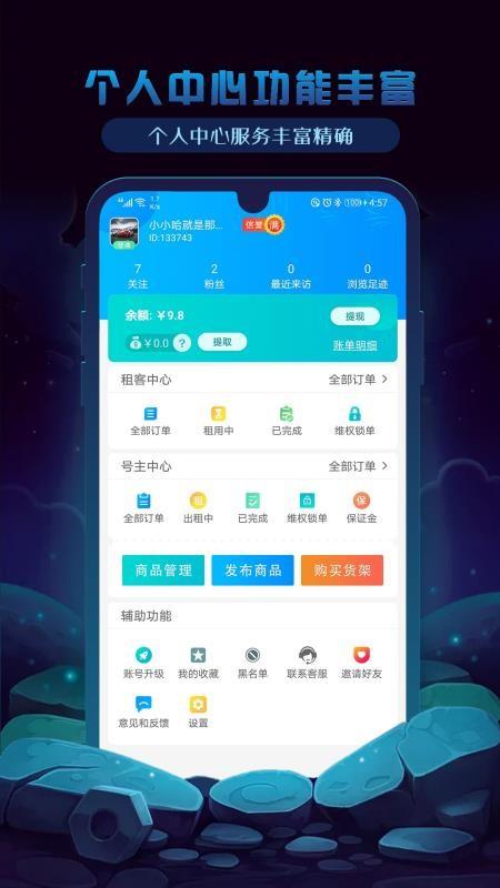 2、进入个人中心,管理【租客订单】【号主订单】,使用【商品管理】等功能。