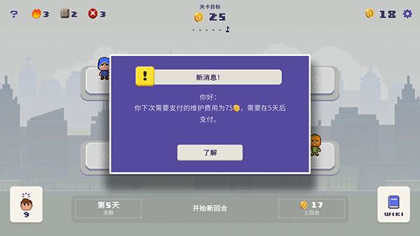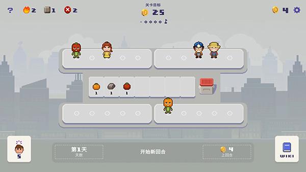 3、日常操作与目标:以天数为进度推进,每天完成金币目标后可随机选择新市民;点击“开始新回合”让市民生产物资与金币。