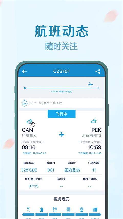 3、航班动态全掌握:弹指间即可掌握南航国内国际直达航班信息,无需登录即可查询当日和前后一天的起飞时间抵达时间。