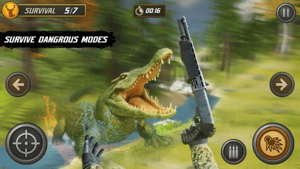 2、任务多样:每个任务都带来全新场景,从猎鹿、猎狮到猎鳄鱼,还要在鳄鱼攻击中生存,持续挑战你的技能。