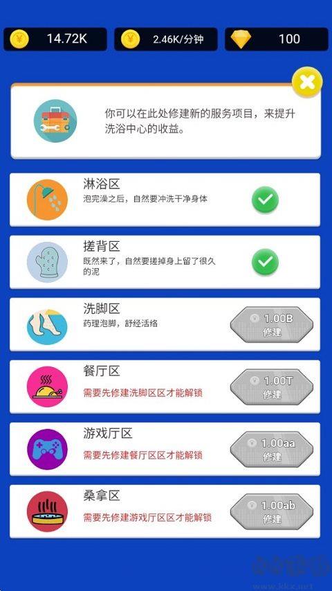 1、经营扩展机制:从基础泡澡区起步逐步解锁SPA水疗等高端服务,设施升级显著提升客单价与顾客满意度。
