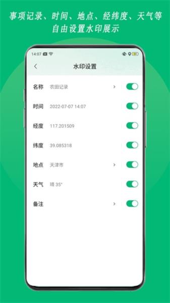 4、此外,我们可以在【水印设置】页面,自由选择名称,如【农田记录】,还能设置时间、经纬度等水印信息。