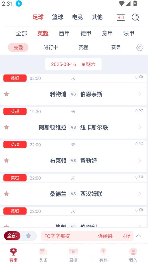 1、赛事涵盖300余种体育项目,全面支持全球各大主流体育联赛和杯赛的比分与数据更新。