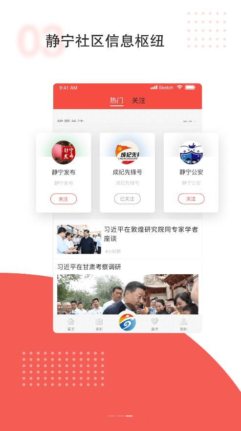 1、进入新静宁App首页后,点击下方的“服务”栏目,进入综合便民服务功能页面。
