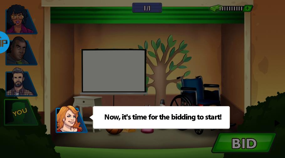 2、画面中出现一个待拍卖的仓库,系统宣布竞标正式开始,竞价环节即将启动。