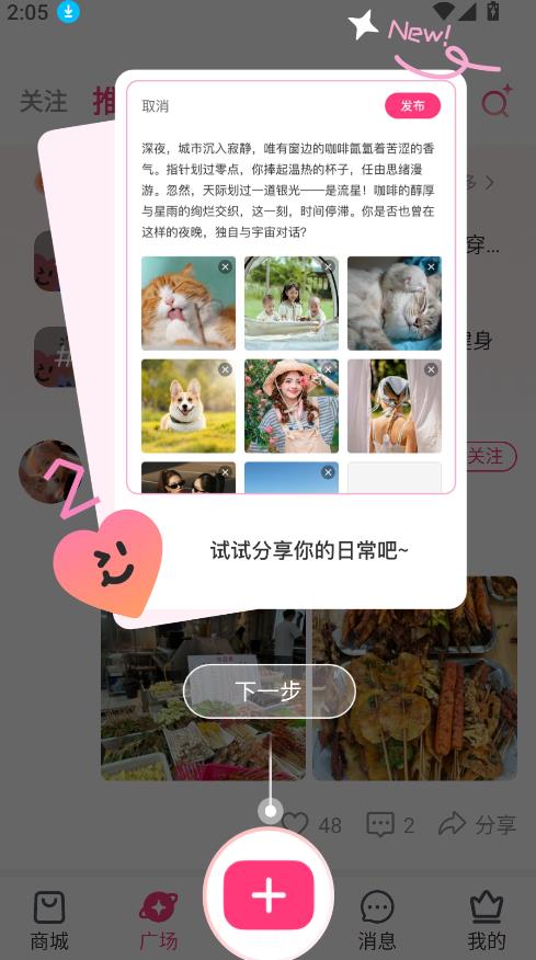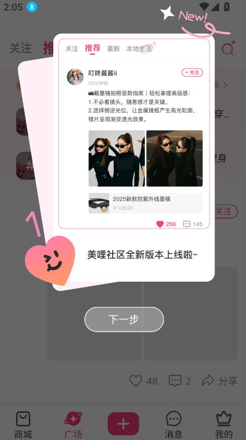 2、点击“广场”页面可查看最新用户动态,了解美妆穿搭、生活分享、健康心得等多样内容。