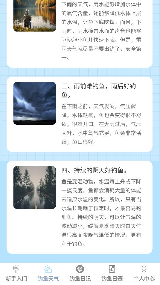 2、是钓鱼知识里“天气与钓鱼”的内容,接着讲不同天气对钓鱼的影响,分三部分。