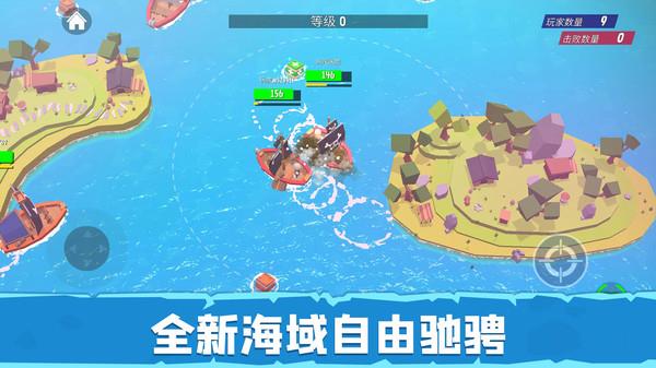 2、操控左侧摇杆移动船只,右侧按钮发起攻击,关注【玩家数量-9】与【击败数量-0】,积累击败数助力升级。