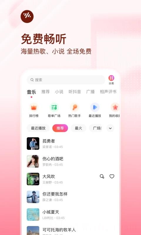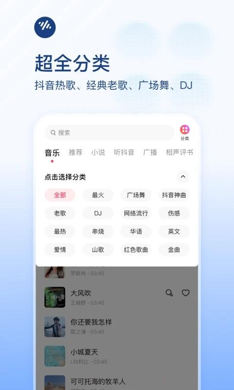 拥有非常全面的歌曲分类标签,让你可以湖区各种抖音热歌、经典老歌、广场舞、华语流行等音乐资源。