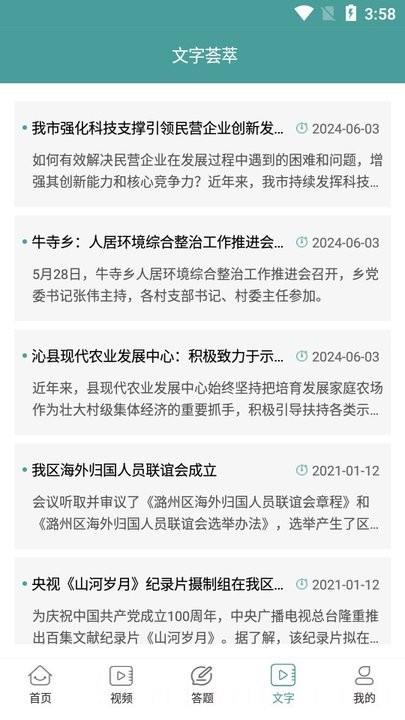 3、功能分区清晰明:设有首页、视频荟集、答题中心、文字荟萃、我的等页面,各页面功能明确,方便用户根据需求快速找到对应服务入口。