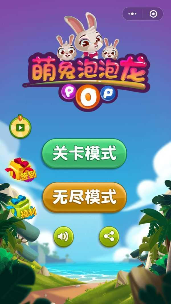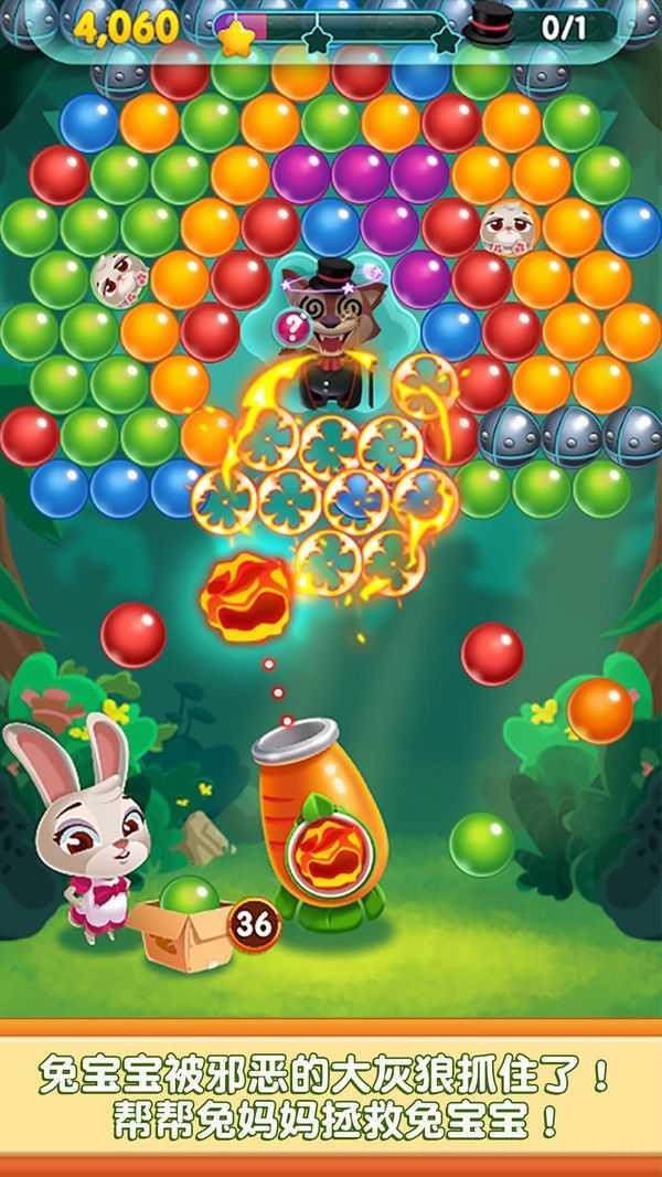 3、持续消除泡泡,积累分数,完成所有兔子解救。
