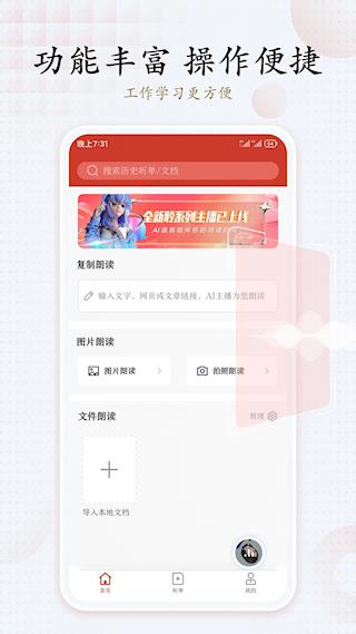 一键阅读:导入文件听,复制网页听,输入文本听,上传图片听,多种格式都可以一键语音阅读
