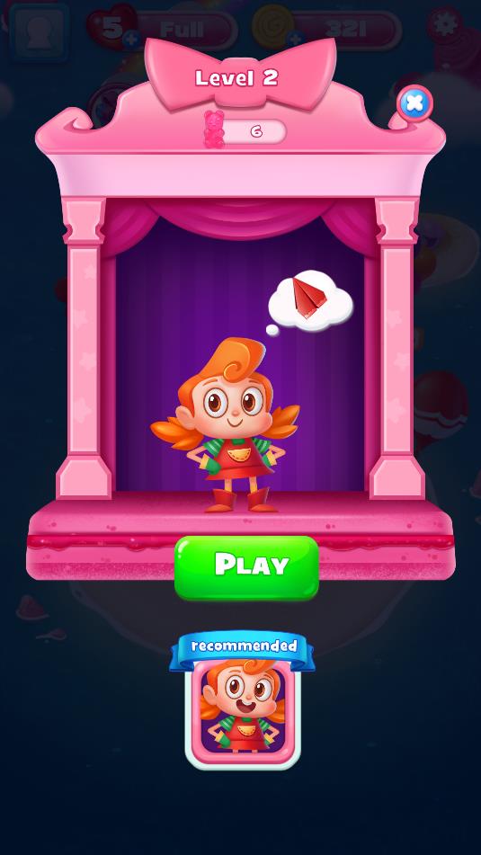 2、完成一行或一列消除时,可以获得一个人偶糖果,集齐6个人偶糖果即可通关。