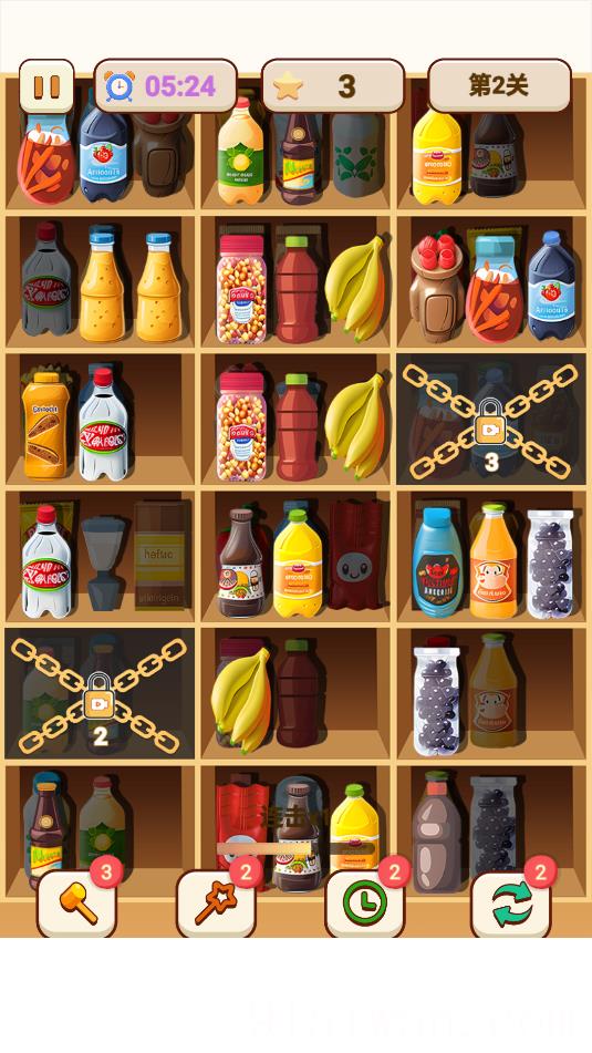 1、操作简单易上手,融合三消匹配与收纳整理,将相同物品放同一货架即可消除。