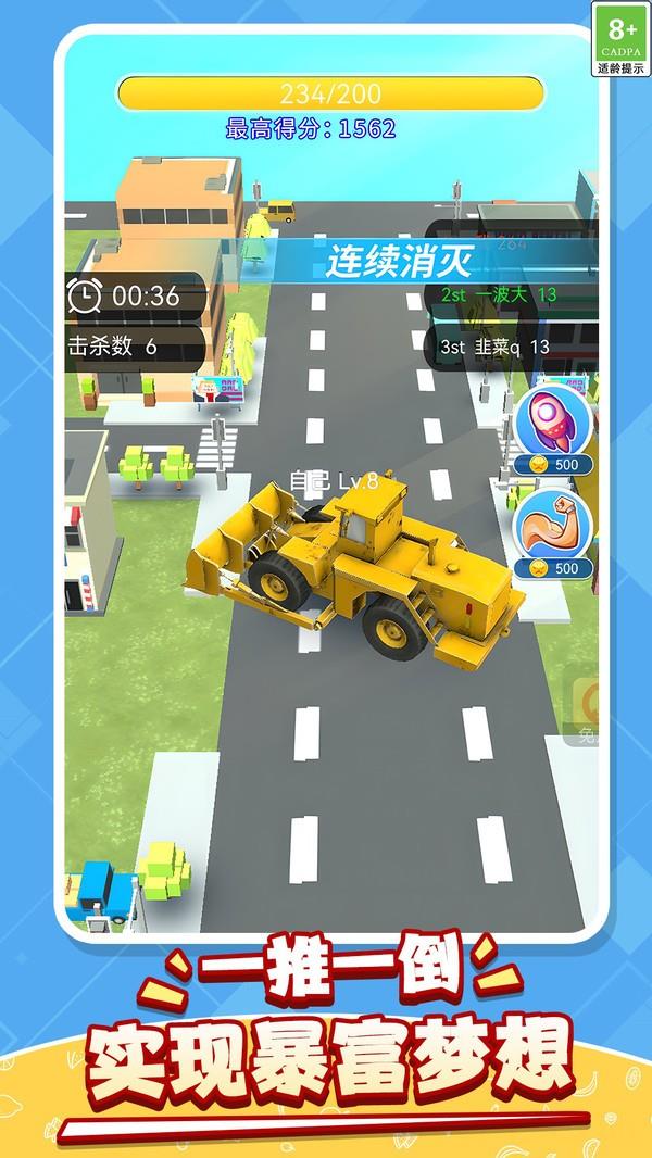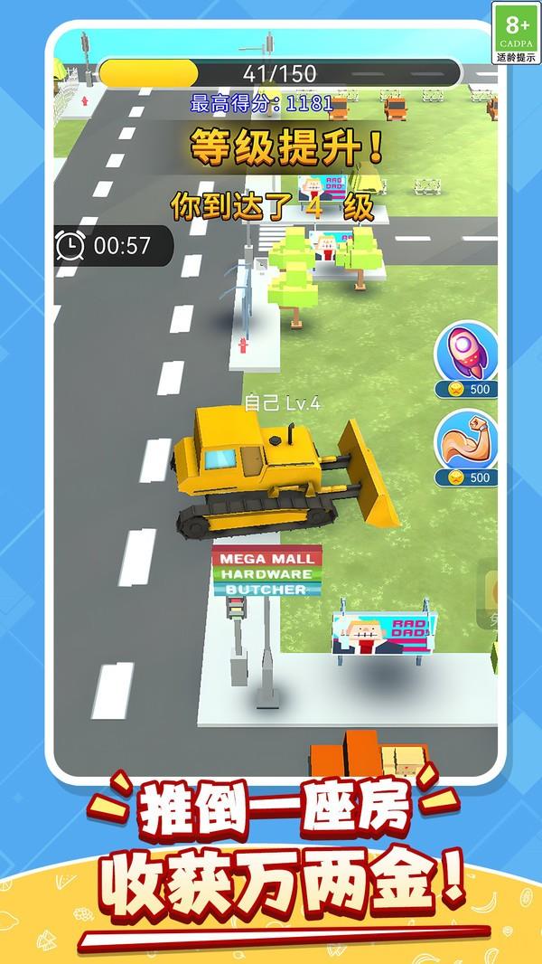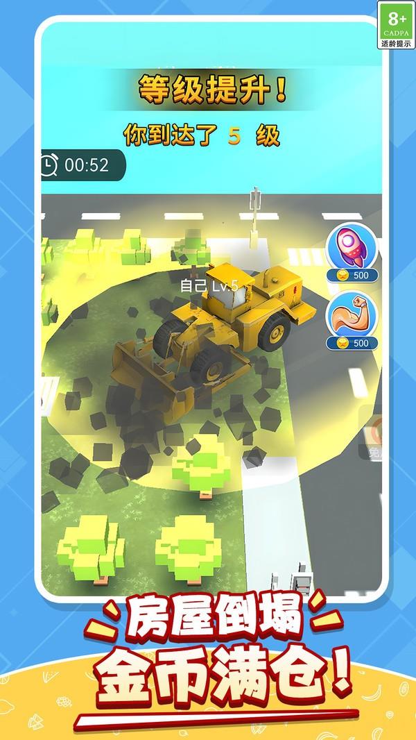 游戏节奏紧凑,你需要在倒计时结束前尽可能摧毁更多建筑,并在过程中收集散落的金币,用于升级装备和提升能力。最令人兴奋的莫过于随机出现的特殊道具,一旦获得,铲车将进入短暂的无敌状态,那种势不可挡的破坏冲击力,令人欲罢不能。