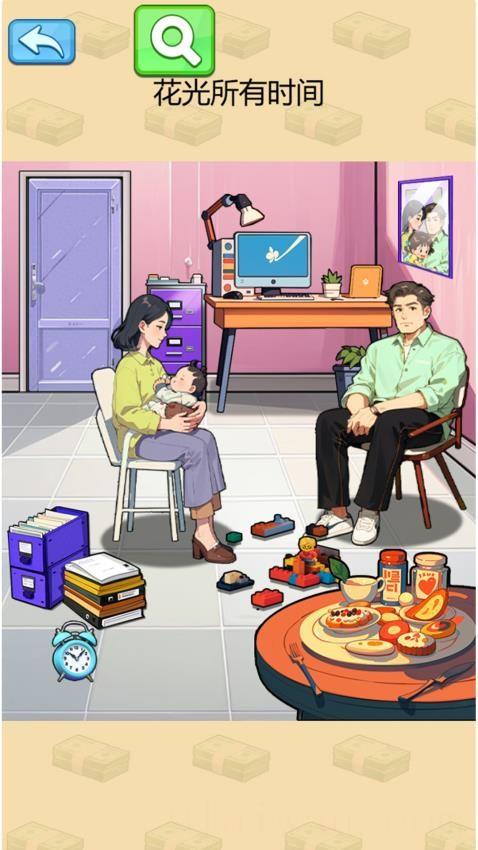 1、进入“花光所有时间”关卡,将红框内的【蓝色闹钟】拖到人物、场景中推进游戏。