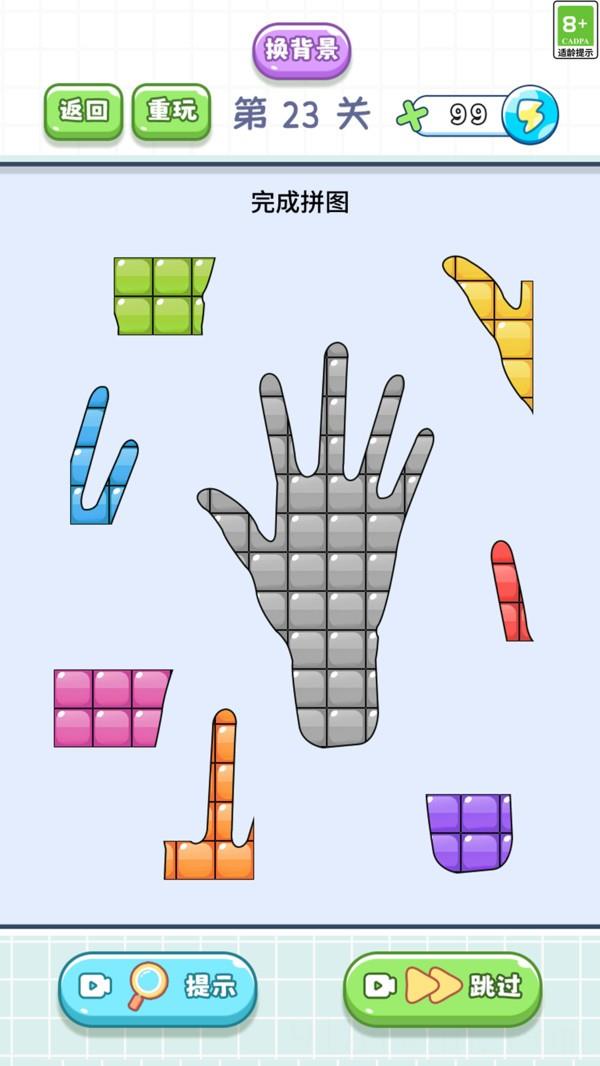 3、成功将所有碎片拼合,组成完整图案,如红框内的图案,即可完成当前关卡。