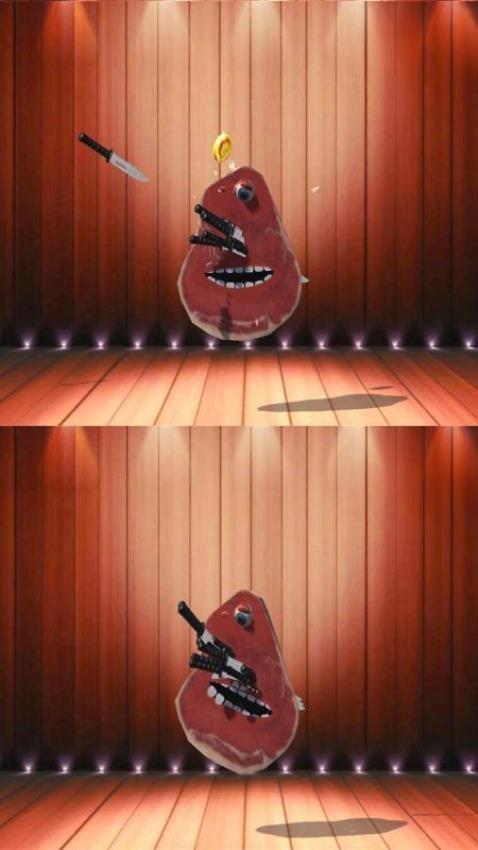 2、选择左侧【解锁】的刀具(如绿色框的刀),投掷切割牛排,获取【金币】,积攒后解锁新工具。