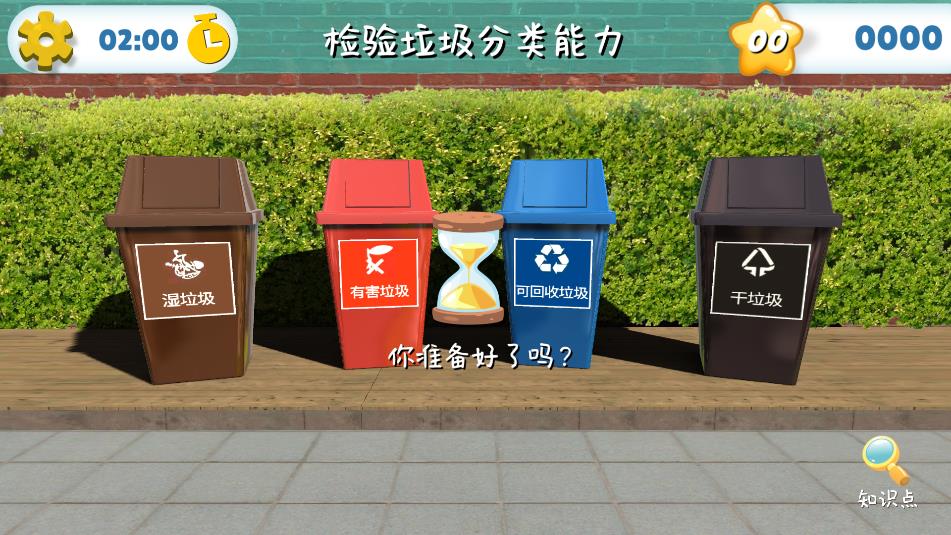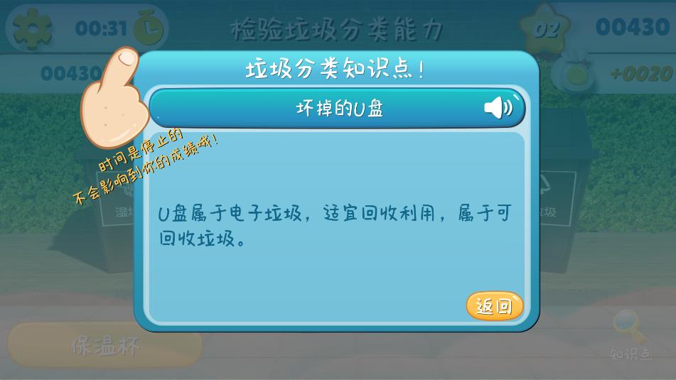3、通过此软件,了解垃圾的分类,界面还有时间、分数等元素,兼具趣味性与知识学习性。