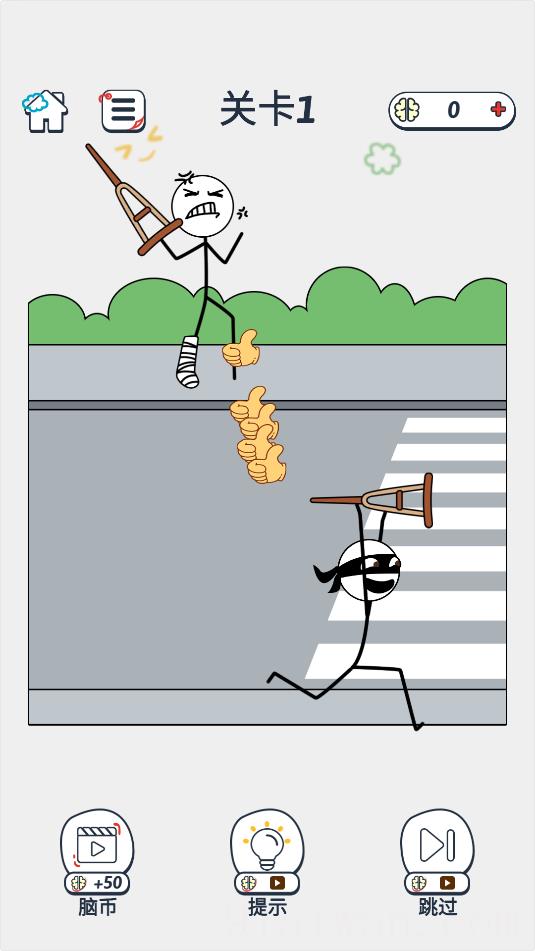 2、关卡1,点击滑动火柴人的手,伸过去把拐杖偷走。