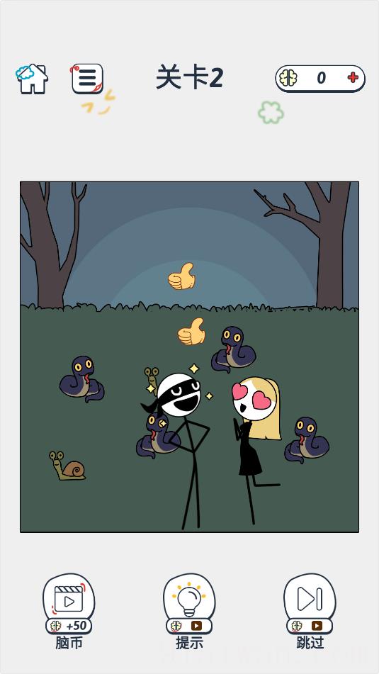 3、关卡2,点击滑动火柴人的手,避开女孩两边的蛇和蜗牛,把女孩救出去。