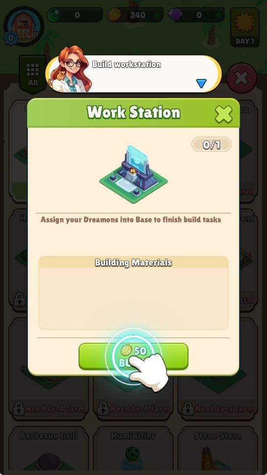 4、确认建筑位置后,点击绿色对勾按钮,花费50金币完成【WorkStation】的建造。