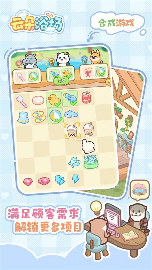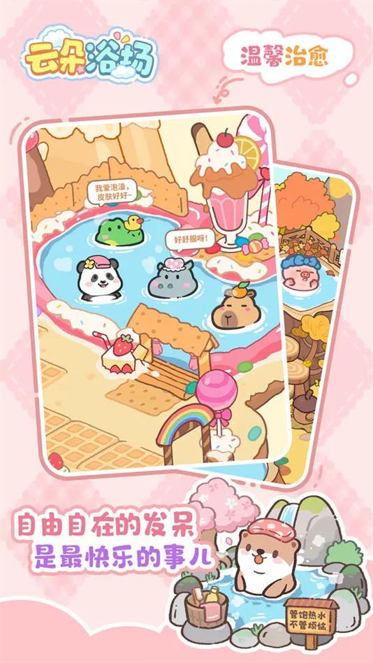 《云朵浴场》是一款温馨治愈的水獺主题温泉经营模拟游戏。在游戏中,玩家将化身为一只水獺,经营一家传统的温泉浴场。你需要为各种小动物顾客提供放松和疗愈的环境,通过完成各类服务任务,赢得丰厚的奖励。游戏采用卡通风格的画面,呈现出温馨宜人的场景,操作简便直观,主要通过点击完成任务。