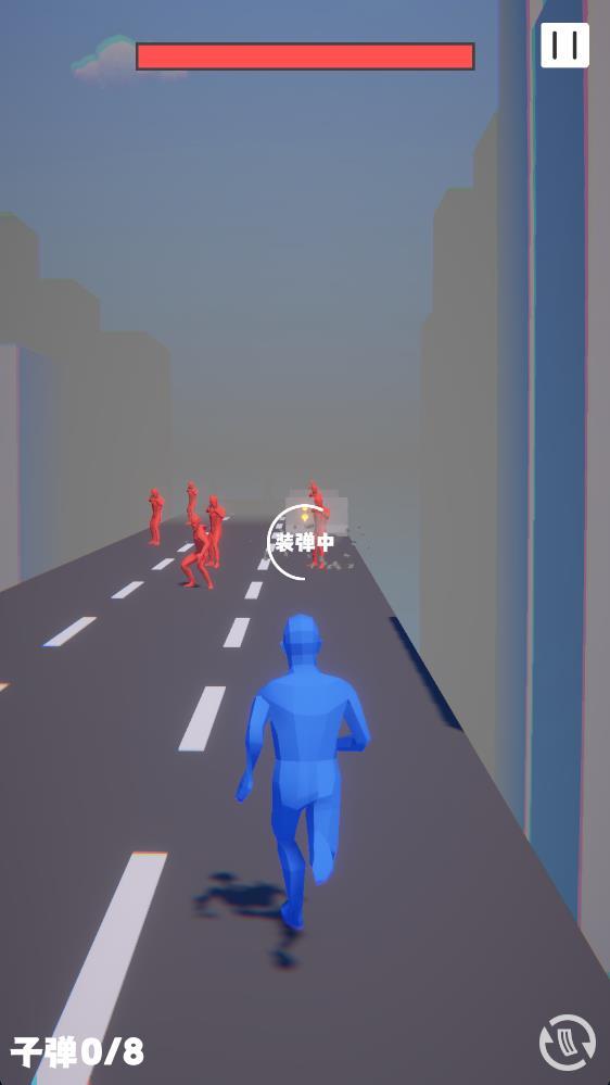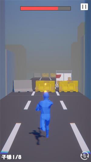 2、操控蓝色角色在城市道路前进,瞄准并攻击红色敌人,推进关卡进程。