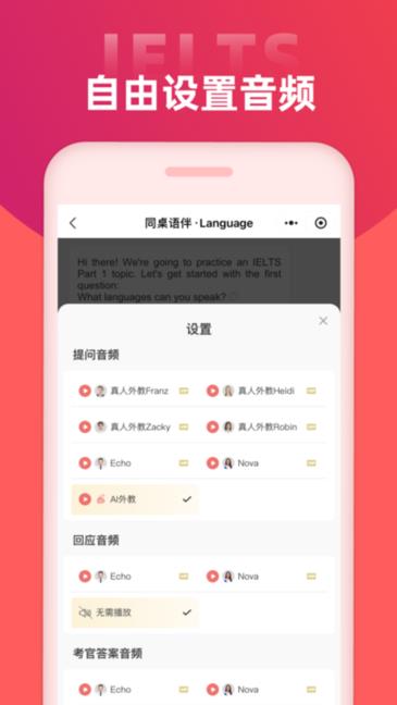 1、聚焦口语陪练,设置完整话题与单个题目两种练习模式,覆盖多类话题,满足不同口语练习需求。