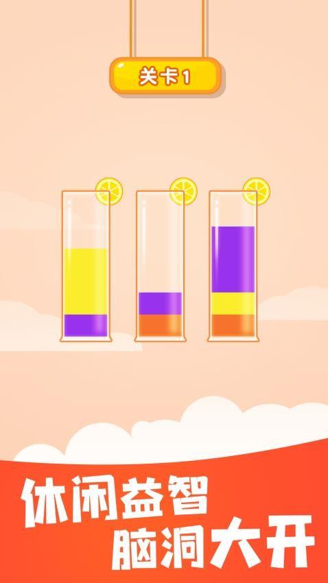 1、关卡设计渐进:难度由简到繁逐步提升,颜色种类与试管数量不断增加,需要不断提高思维与观察能力才能顺利过关。