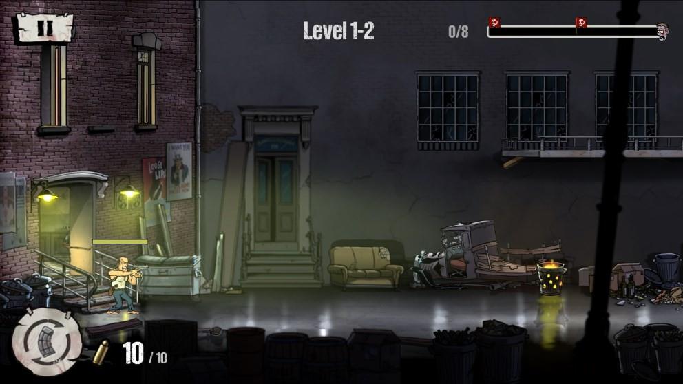2、在【Level-1-1】关卡中,瞄准右侧僵尸射击,留意弹药量【7/10】,利用场景掩体规避危险。