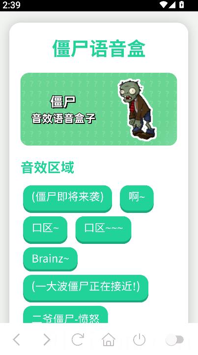 1、打开已安装的僵尸语音盒应用后,主页展示多个音效区域,可选择不同类型的僵尸语音或恐怖音效进行试听与使用。