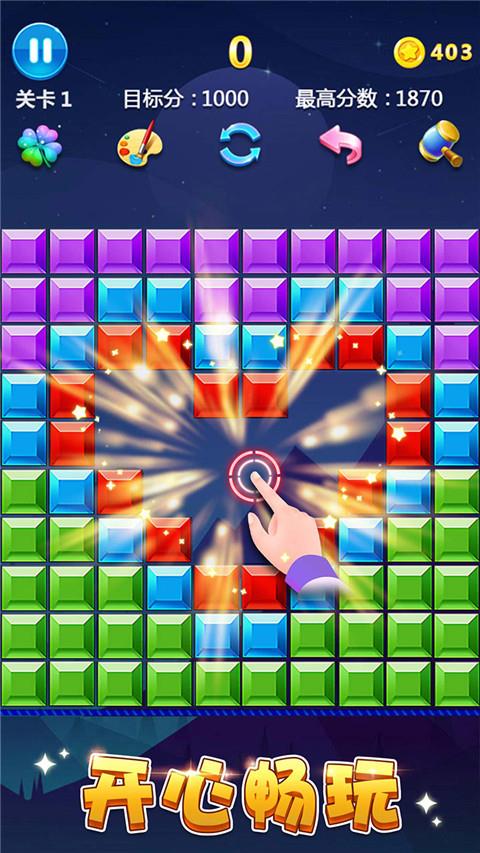 3、遇到困难时,利用上方刷新、锤子等道具,调整方块或消除阻碍,优化拼接。