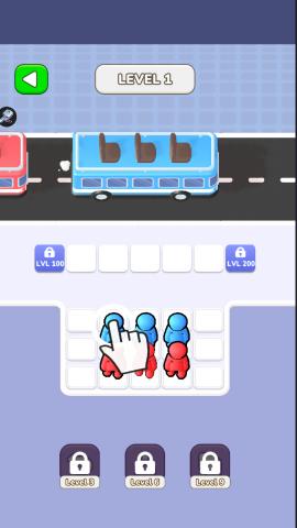2、送走红色小人后,再根据公交车颜色,点击【蓝色小人】,将其送到蓝色颜色的公交车上。